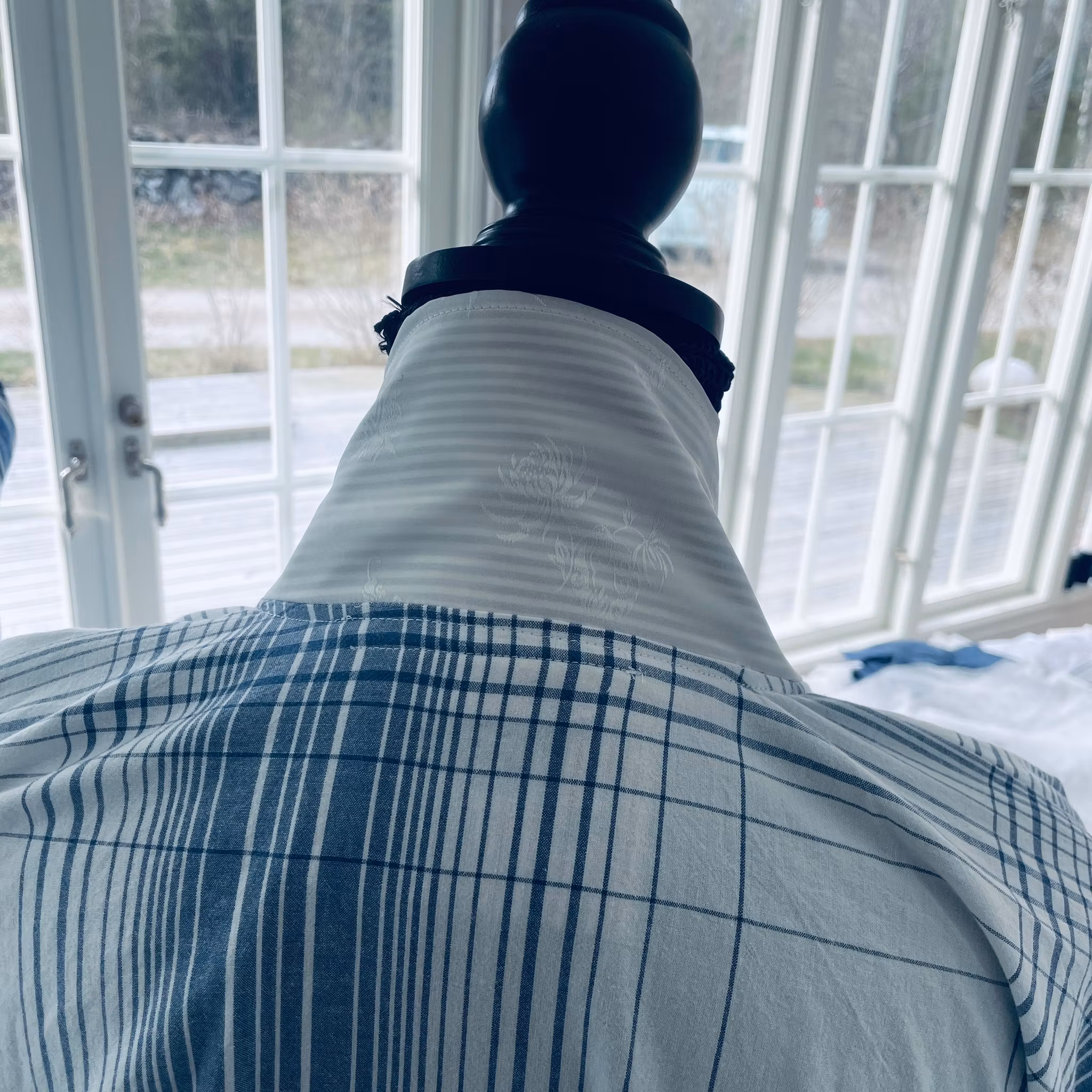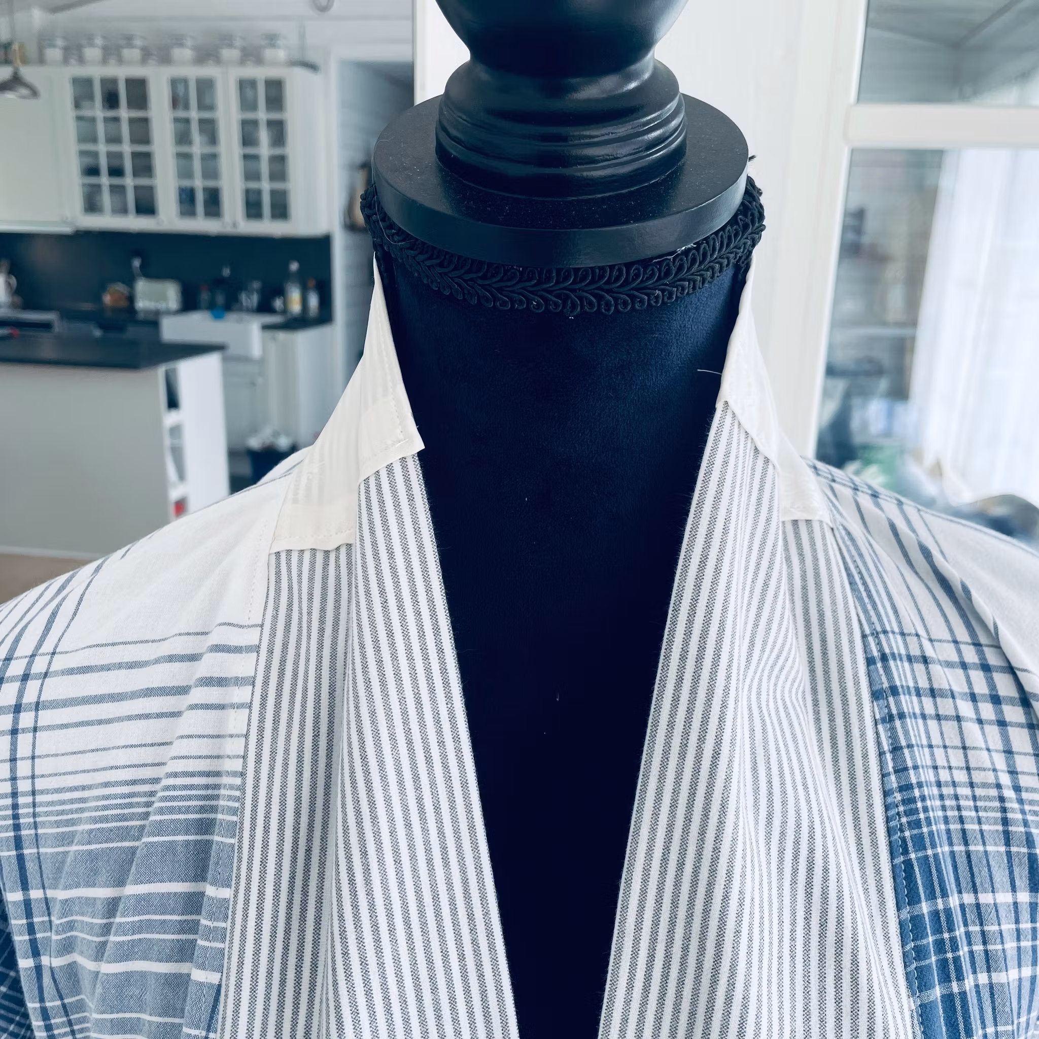 Romantisk kimono med volanger i härlig kombination av blått/vitt och grått. Ingår i serien ”Japan möter Blekinge”. Tillverkad av två påslakan där ena är grå/vit randigt och andra i blå/vit rutigt i mjuk skön bomull.