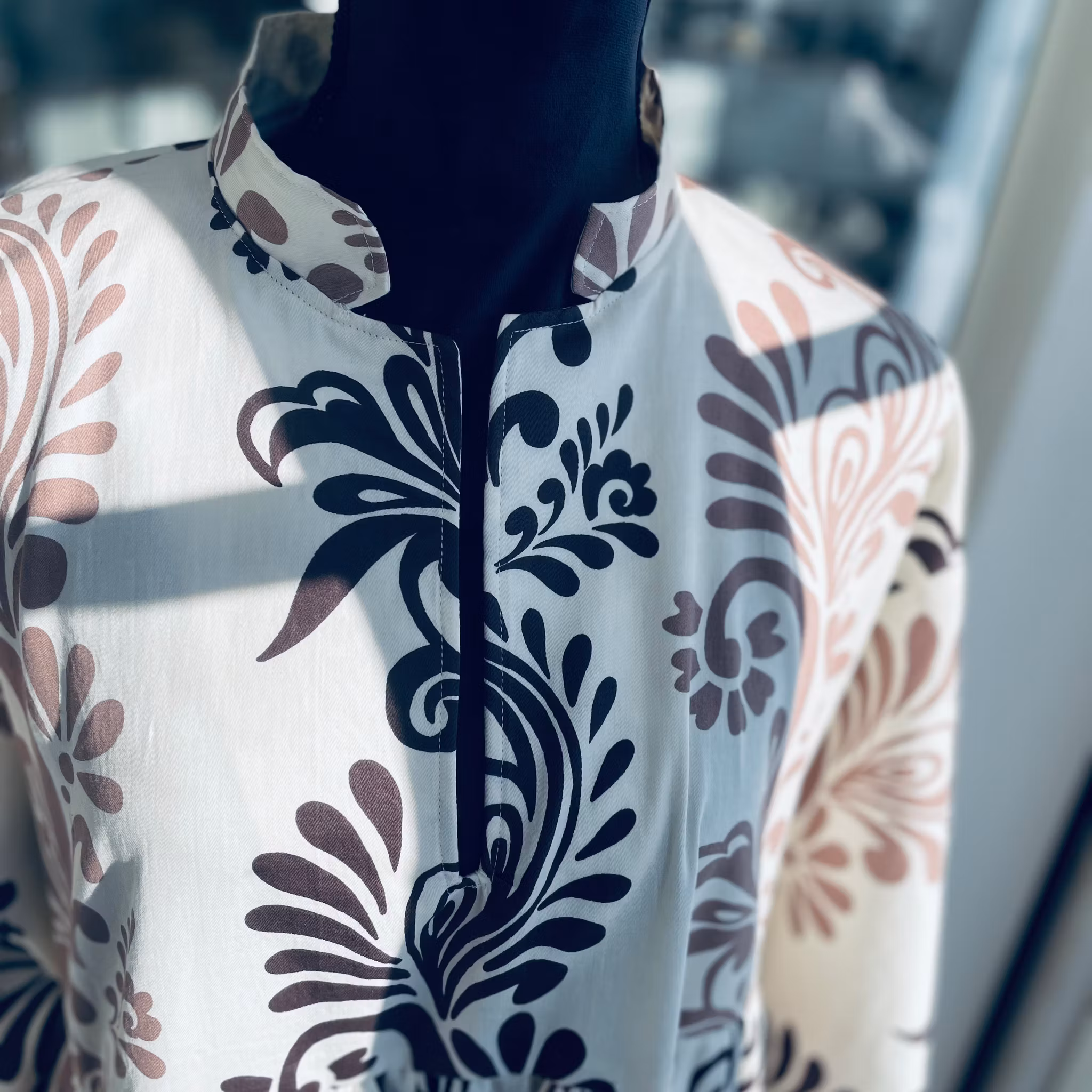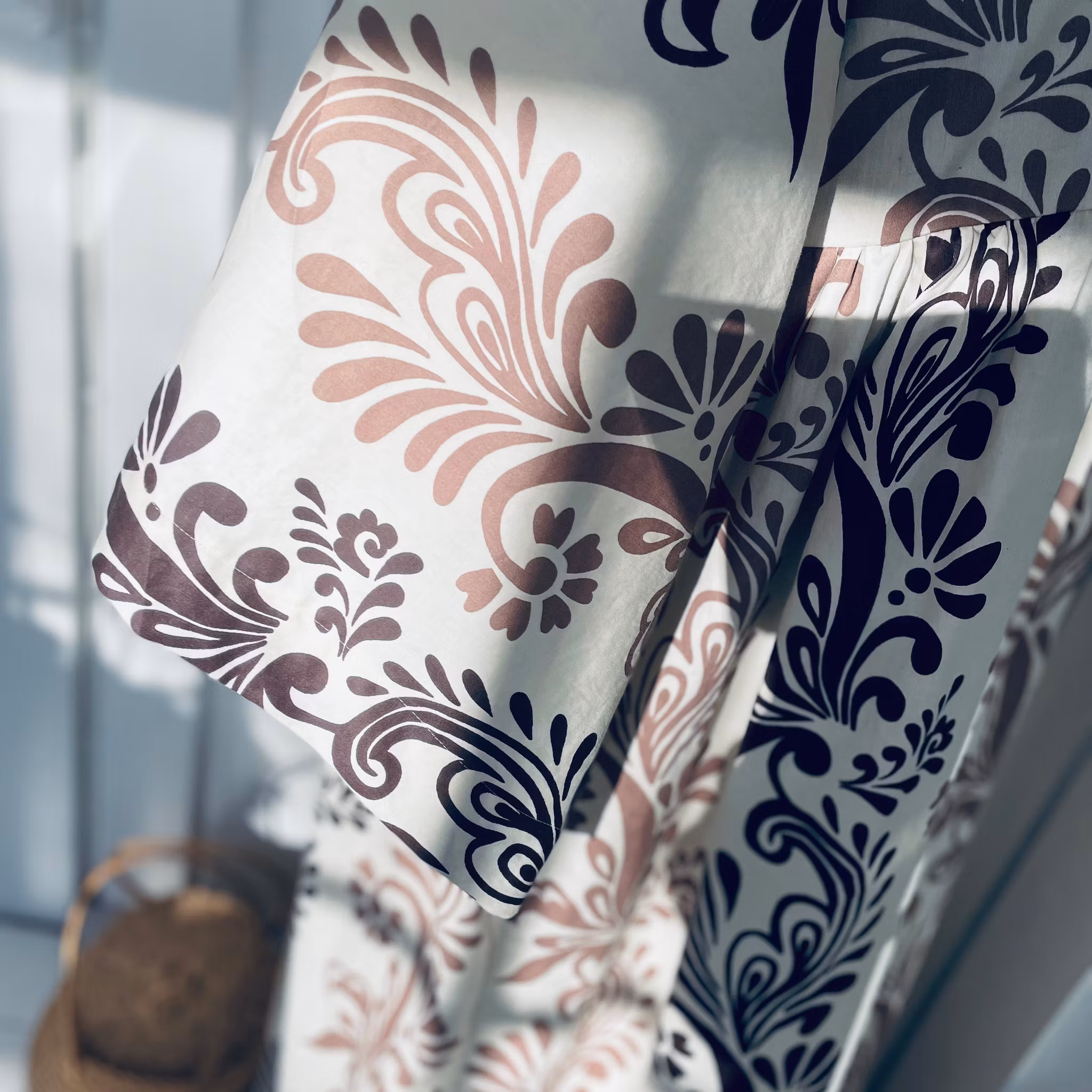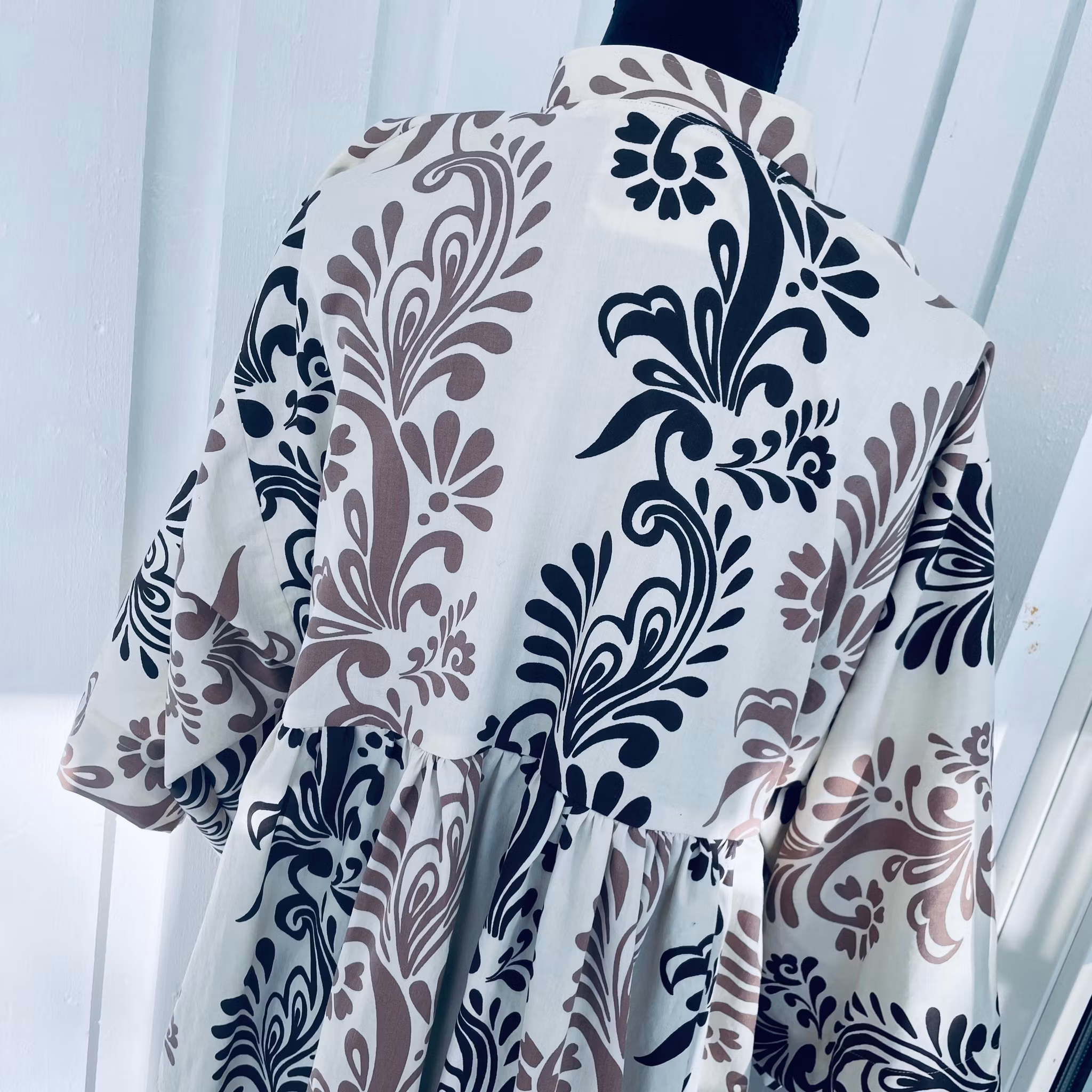Se mått för storlek. Byst ca 110 cm, stuss ca 190 cm, Längd ca 142 cm. Ornamentmönster i svart och choklad brunt på offwhite botten.